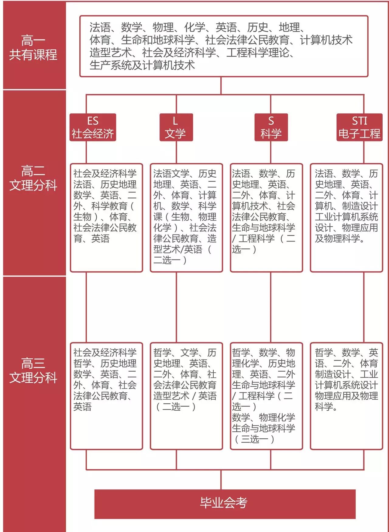 高一学年,学生将会一起学习法语、数物化学、生命和地球科学、社会经济、计算机等科目,并由高二开始分科教学 为高三的会考进行预热。