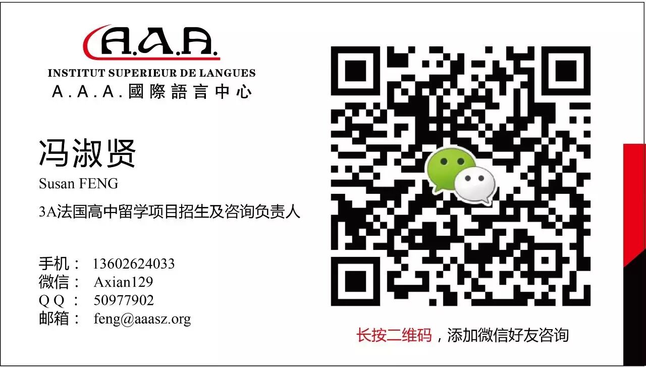 位于深圳南山CBD的A.A.A国际语言中心,自2009年起就开始组织国内中学毕业生前往法国继续高中学习的项目。负责对候选学生进行国内阶段的法语基础教育,至今已经接待了八届学生,积累了一系列的针对欲前往法国就读高中学生的法语教育经验。